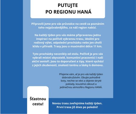 Přejeme vám, ať je pro vás každý týden dobrodružstvím. Obujte pohodlné boty, nechte se vést a objevte skryté poklady, kouzelná zákoutí a jedinečnou atmosféru Regionu HANÁ.