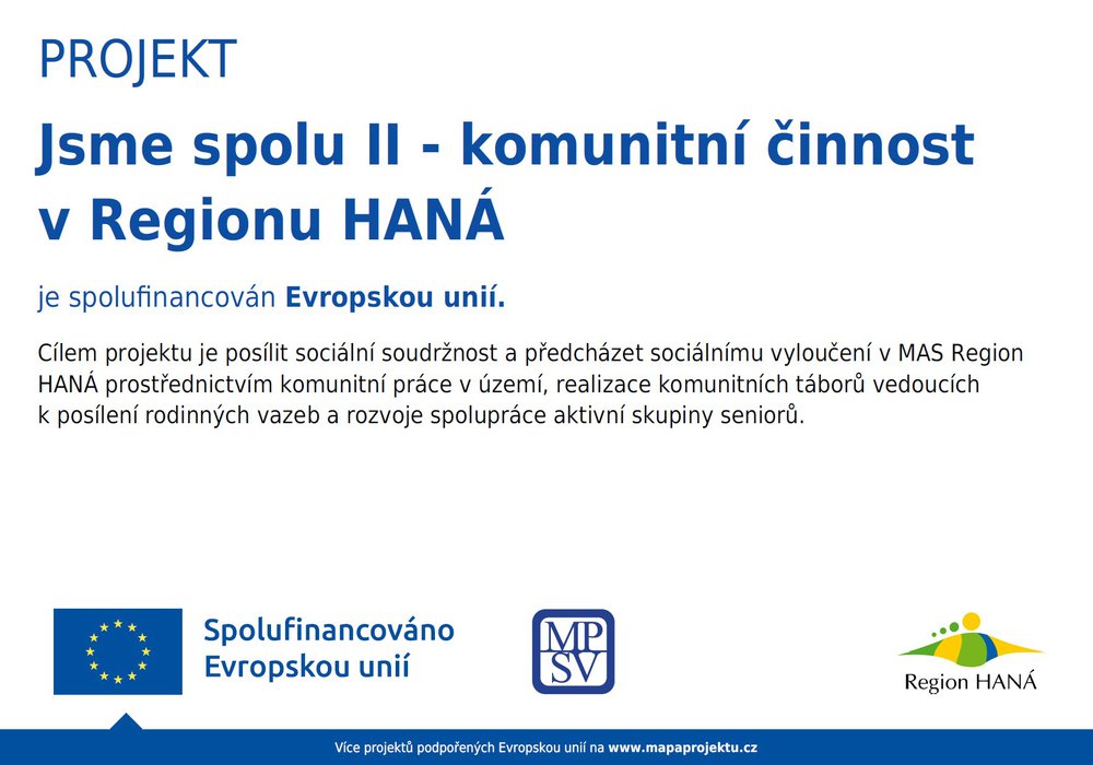 Region HANÁ z.s, je realizátorem projektu "Jsme spolu II – komunitní činnost v Regionu HANÁ" reg. číslo CZ.03.02.01/00/25_084/0006284, který je podpořený z Operačního programu Zaměstnanost Plus. Projekt bude navazovat na již dva realizované projekty, které úspěšně podpořily komunity v území MAS.