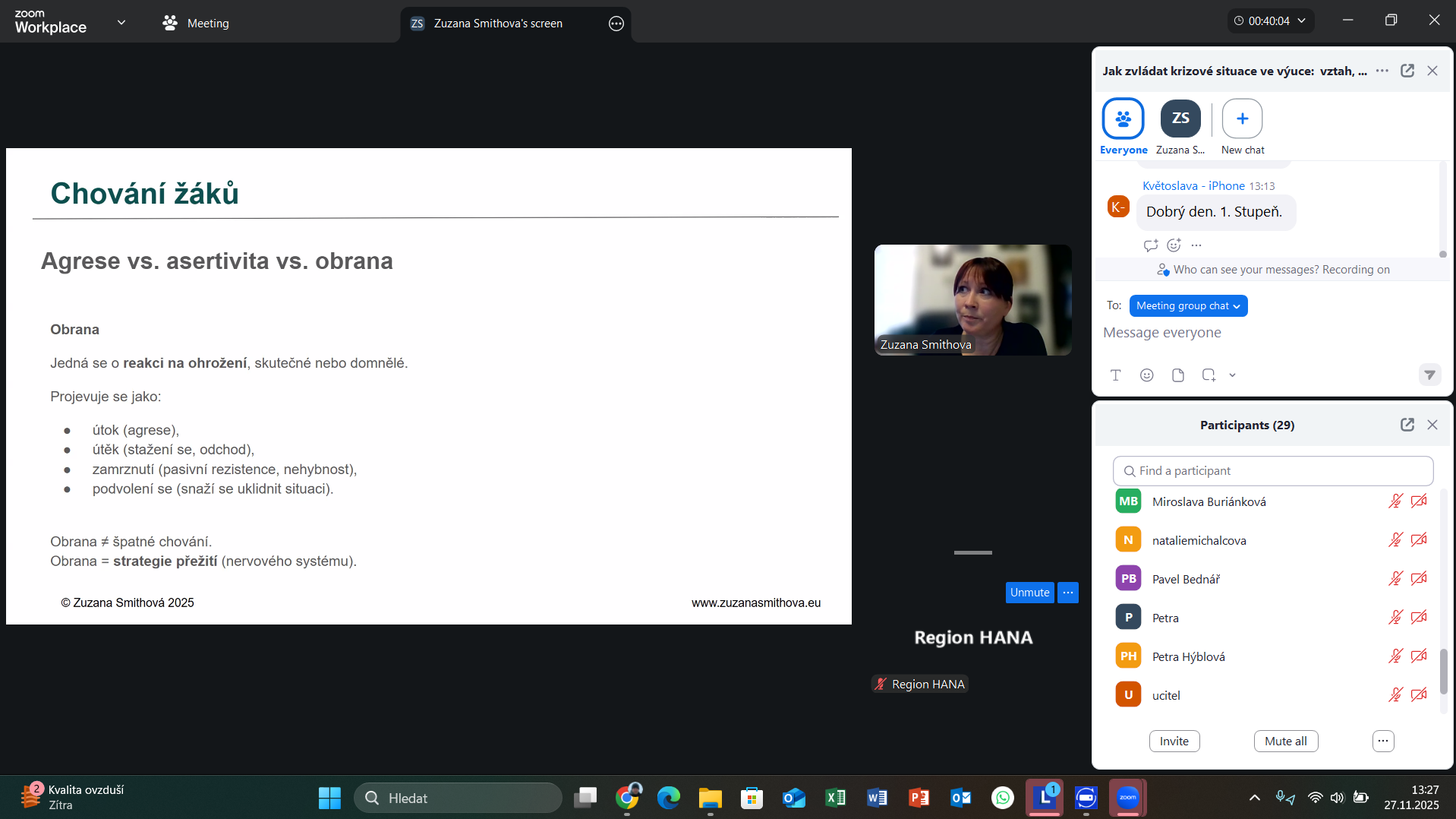 Webinář nabídl pohled na zvládání náročných situací ve výuce nejen z hlediska krizové komunikace a deeskalace, ale také z perspektivy budování bezpečného vztahu mezi učitelem a žákem. Účastníci se seznámili s principy, jak obnovit kontakt se žákem, jak reagovat v konfliktních situacích a jak předcházet problémovému chování prostřednictvím prevence a vědomé práce s klimatem třídy. Místo konání: online prostřednictvím platformy ZOOM