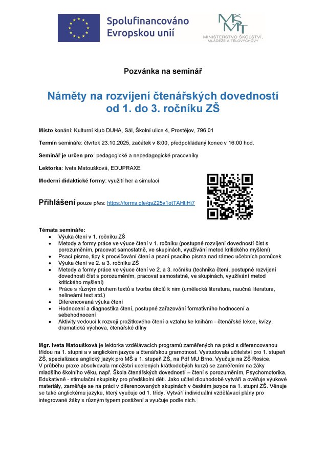 Seminář "Náměty na rozvíjení čtenářských dovedností od 1. do 3. ročníku ZŠ"